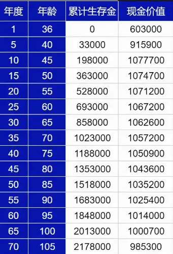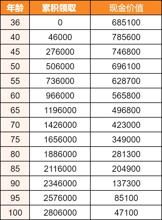 你比如100岁的时候已经领走了201万,是投入钱的两倍,但账户里现价还有100万不止!