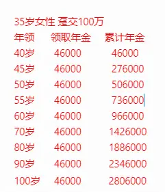 还是35岁女性100万一次性投进去,40岁就能领先同龄人20年原地退休,每年固定领46000,相当于每年能吃4.6%的收益,折合到每个月就是快4000的水平!