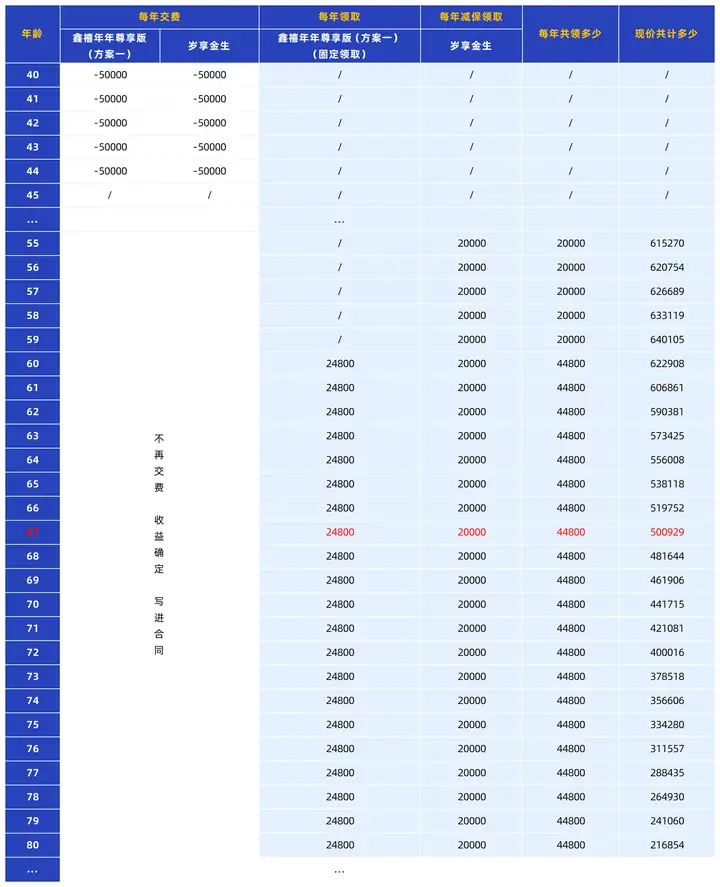 她今年40岁,手上有50万左右存款,打算分5年放进养老年金险和增额寿里,咱们一起来看看领钱情况如何:
