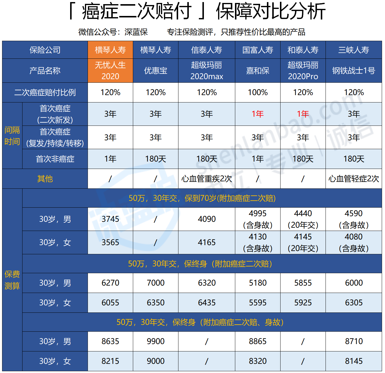 和同类产品相比,无忧人生 2020 附加癌症 2 次赔,会有优势吗?我这里也将含身故的情况,一起对比: