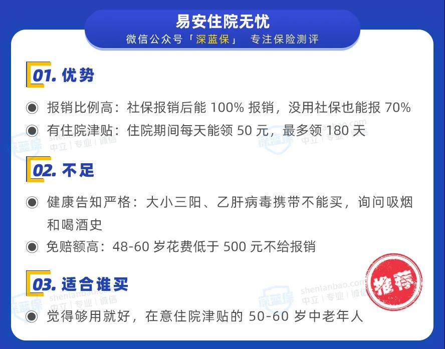 50 - 60 岁的中老年人,可以考虑 易安住院无忧 ,它的优势和不足供大家参考:
