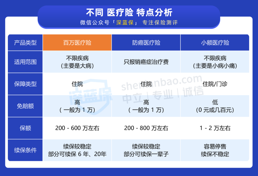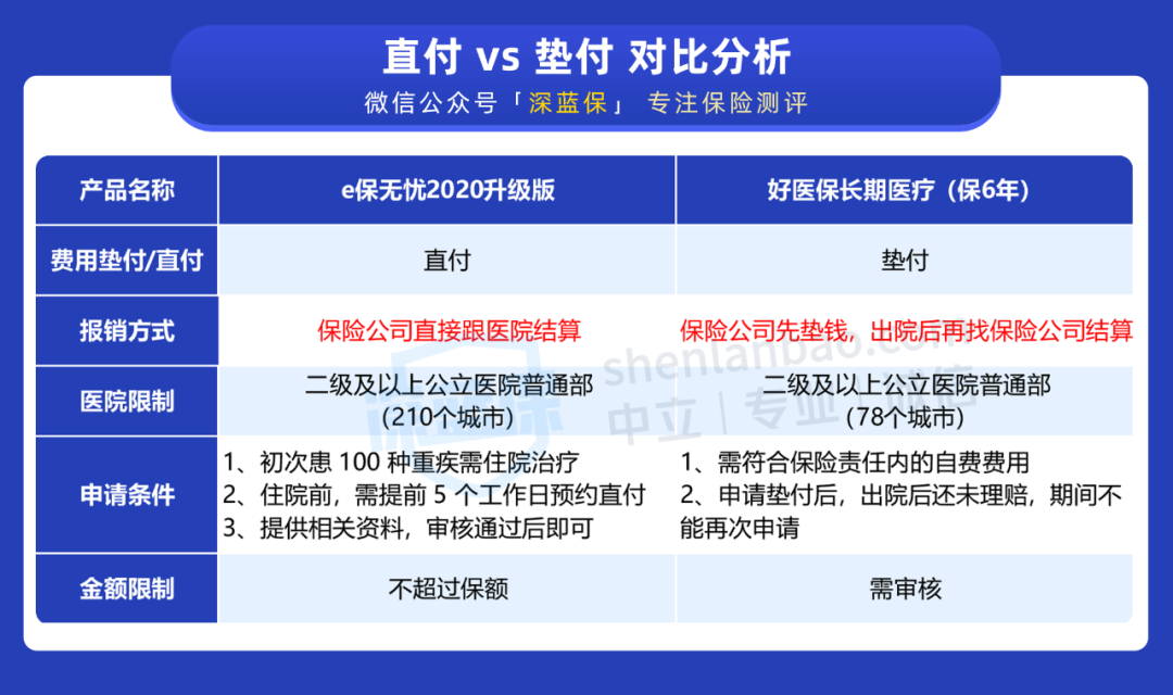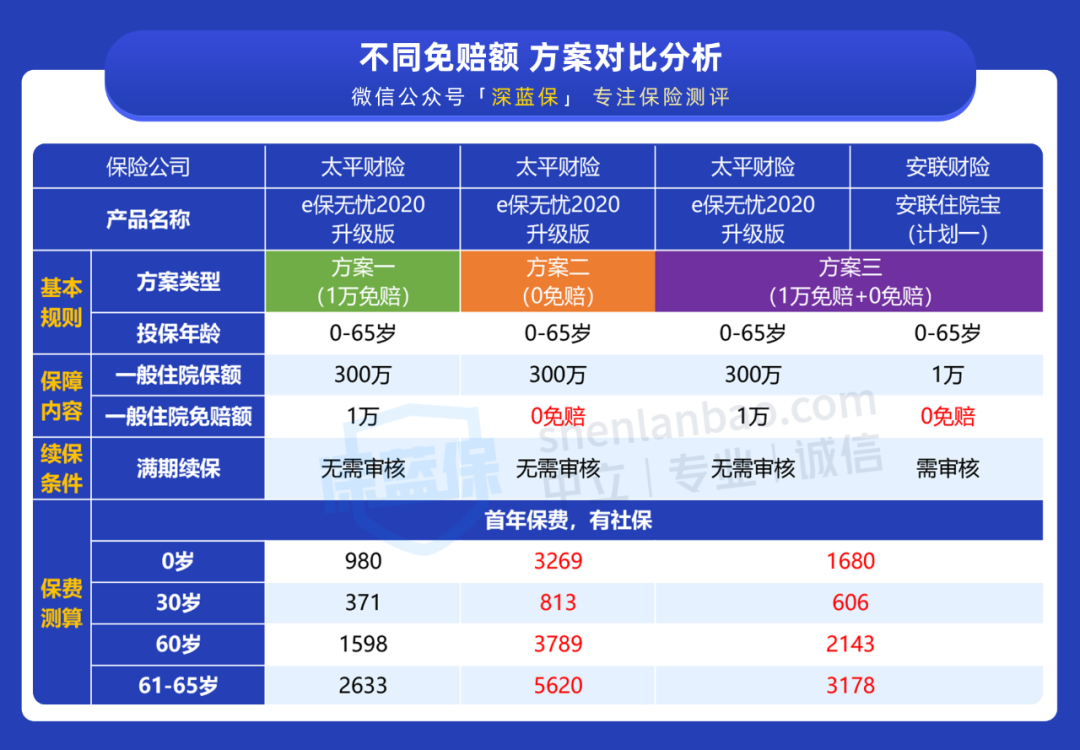 实验室就来详细分析下,主要内容如下: 医疗险那么多,到底该怎么选? e 保无忧 2020 升级版,全面测评分析! 买了旧版产品,能升级到新版吗? 医疗险 能报销生病住院的医疗费,虽然看起来很简单,但实际上种类有很多。 如果闭着眼睛随便买,会很容易买错,导致无法理赔,最常见的有以下 3 种: 直接说结论: 对于大部分朋友来说,一定优先考虑百万医疗险,不能买的话再考虑防癌医疗险。 毕竟这种高额的大病费用,才是我们要重点关注的,一旦发生,就会严重影响正常生活。 而小额医疗险(点击查看)并不是必需的,普通的小病小痛花不了几个钱,即便不买自己也完全能承受,可以根据自身情况来选。 我们重点来聊下百万医疗险,这类产品经过几年不断升级,保障都已经很不错了,而且还有许多增值服务,其中比较实用的就是 垫付、直付。 主要是在自己没钱看病时,保险公司能帮你付钱,大家只要知道直付比垫付更好就行了,两者的区别会在 第二段 详细分析。 下面就一起来看看,能直付的 e 保无忧 2020 升级版,是否值得买? 为了能让大家直观了解,我们将升级前后的差异,整理成一张表格: 升级前后差异很小,新版本主要多了 3 点变化: 投保更宽松:甲状腺结节、糖尿病、高血压等疾病,都有机会投保。 外购药报销更好:如果没有经过社保报销,对于社保外的外购药也能报销 100%,而旧版是 60%。 可选 0 免赔:多数产品只能报销 1 万以上的住院费,而 e 保无忧 2020 升级版还能选 0 免赔版,报销门槛更低了。我们会在 第四段 详细分析。 为了大家能更快速了解这款产品,我们总结了它的 3 个特点: 特点1:能提供住院直付 如果患了条款里的 100 种重疾,住院后的花费就由保险公司和医院直接结算,自己完全不用操心。 有朋友可能会好奇和垫付的区别,这里我们以好医保来作为对比: 相比于垫付,直付最大的特点就是方便,出院了直接走人,不用再跟保险公司申请报销,就医体验会更好。 一般来说,直付更多是高端医疗险(点击了解)才会有的服务。 这里也要提醒大家,如果罹患的不是约定的 100 种重疾,那么就没法享受直付了,只能自己先掏钱,出院了再报销。 特点2:核保更宽松 有时候并不是不想买医疗险,而是压根买不了。 相比于老版,升级后的 e 保无忧 2020,放宽了对甲状腺结节、高血压、糖尿病的核保要求: 之前因为这些疾病买不了的朋友,现在依然有机会能买。 我们也和市面上的主流产品对比了一下,发现还有个别医疗险,对高血压、糖尿病核保会更宽松,点击这里就能看到之前的分析>>> 大家可以多款产品都试一下,挑核保结论最好的来买就行。 特点3:最高65岁都能买 年龄越大,生病住院的概率就越高,因此多数医疗险会限制投保年龄。 e 保无忧 2020 升级版最高 65 岁前都能买,对于高龄老人来说,又多了一款新选择。 总的来看,升级后的 e 保无忧还是不错的,那到底值不值得买呢?下面详细分析一下。 目前市面上同类产品有很多,只有详细对比后,才能知道该怎么选。 我们选了市面上比较不错的 6 款产品,来一起对比下。 直接说结论: 如果 60 岁以下:优先考虑 好医保(保 6 年)、好医保( 保 20 年),整体保障很全面,其中保 20 年的好医保,更适合年龄偏大的人买,比如 55 岁买,能直接保到 75 岁。 如果 65 岁以上:众安/平安好医保 价格最便宜,保障也很不错;e 保无忧 2020 升级版 有直付服务,报销体验会更好。 如果大家还想了解更多高性价比的产品,可以看下我们最新的《 1 月医疗险推荐清单》。 e 保无忧 2020 升级版,可以附加 0 免赔、癌症特需、重疾赔付。 下面我们来详细分析下,这几项保障是否值得选? ① 零免赔版本,值得选吗? 大多数百万医疗险只报销 1 万以上的住院费,而 e 保无忧 2020 升级版附加 0 免赔后,就几乎不用自己掏钱了。 如果大家也想报销 1 万以下的费用,我们更建议通过 百万医疗险 + 小额医疗 来一起搭配。 我们设计了 3 种不同的方案: 3 种方案具体差异如下: 方案一:只买百万医疗,价格最便宜,不过 1 万以下的费用自己承担。 方案二:e 保无忧 2020 升级版附加 0 免赔,但价格会很贵。 方案三:同样能达到 0 免赔的效果,价格也便宜很多,不过要向两家公司分别理赔,过程会麻烦一些。 其实对于大多数人来说,我们觉得 方案一已经足够用了,毕竟一万以下的费用,自己也完全能承受。 优先保障大病就好,没必要全都指望保险报销,省下来的钱还能配置其他保险。 当然,如果你真的想全额报销,我们建议选择 方案三,毕竟效果差不多,价格还更便宜。 ② 赴日医疗、特需,要选吗? e 保无忧 2020 升级版还能附加癌症特需、赴日医疗,这两项保障都是针对于癌症。 具体保障如下: 癌症特需:罹患癌症,能报销医院特需部的费用,这里有更专业的医生,以及更好的就医环境(点击了解)。 赴日医疗:日本的癌症治疗手段世界领先,附加后,能报销在日本治疗的 70% 费用。 如果特别在意癌症,想要更好治疗效果的朋友,可以考虑附加。 每项保障附加后,保费大概会上浮 22% 左右,根据自己的预算来考虑就好。 此外,重疾赔付不建议附加,不仅只能保 1 年,而且价格也不便宜,直接单买长期重疾险(点击了解)会更划算。 医疗险本身比较复杂,我们整理了两个大家可能会关心的问题。 ① 之前买了旧版,能升级到新版吗? 我们咨询过保险公司客服,得到的回复是: 快到期时会收到续保短信,点击里面的链接就能升级。 相