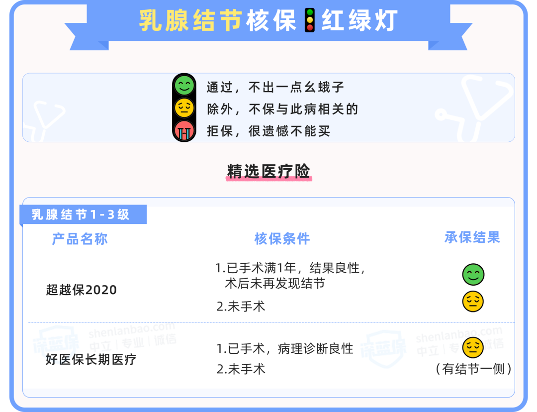 精选 」直接投保。 我们精心挑选了 2 款宽松的医疗险,供大家参考。 先说结论: 乳腺结节投保医疗险,相对严格一些,要正常承保一般需要手术切除结节。 下面分别来看下产品的点评: 乳腺结节 1 - 3 级已手术 超越保2020 有机会正常承保,未手术只能除外。 超越保2020 免赔额可逐年递减 1 千,最多可减 5 千,理赔门槛降低了。详细测评,点击可查看>>> 好医保长期医疗 对 1 - 3 级的结节只除外有结节一侧的乳房,未手术人群可优先考虑。 好医保除 6 年期保证续保外,还有一款 好医保(20年),能保证续保到 20 年,但 20 年到期需审核,而 6 年期的不需要。详细测评,点击可查看>>> 该产品可支付宝搜索「 江南app官方下载苹果