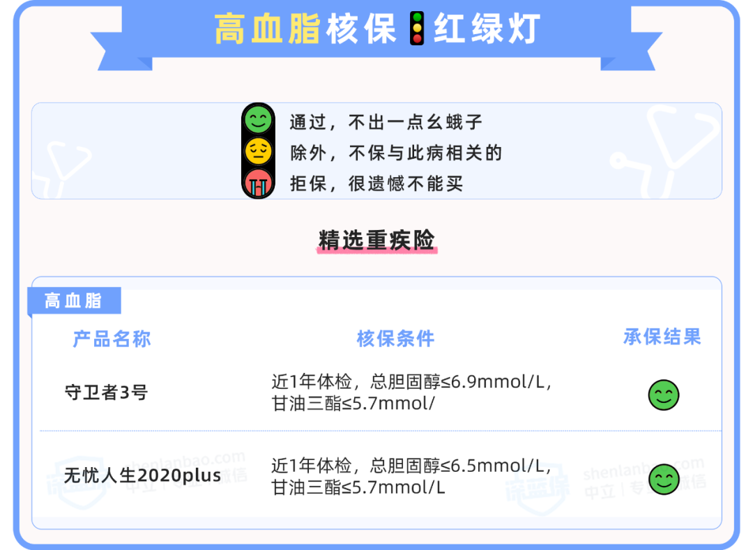 高血脂满足总胆固醇 ≤ 6.9mmol/L,甘油三酯 ≤ 5.7mmol/L,守卫者3号 可以正常承保。