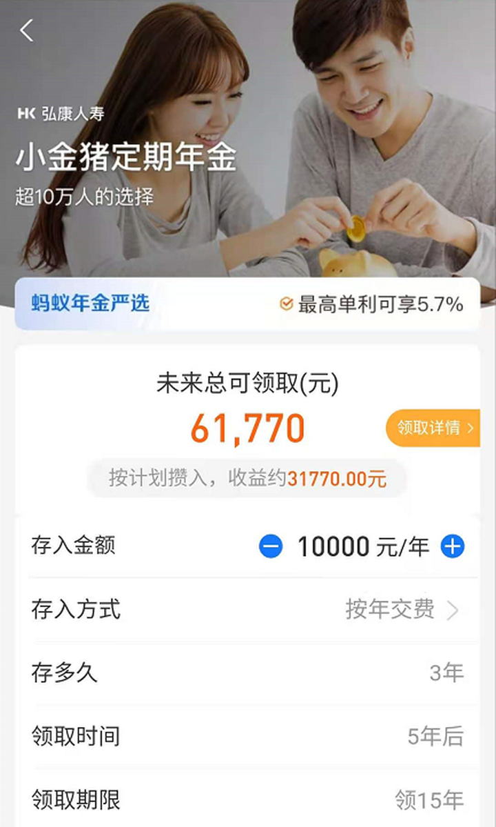 我们拿支付宝上的小金猪年金为例: