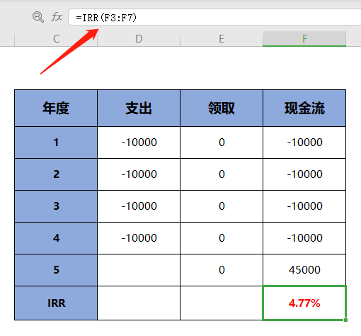 前面 4 年都拿出了1万,现金流就输入-10000;第5年到我们领钱了,就输入45000。