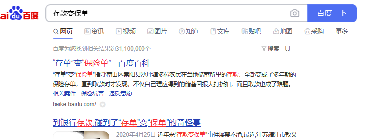 深蓝君在百度搜了一下“存款变保单”,一共得到3千 万个结果: