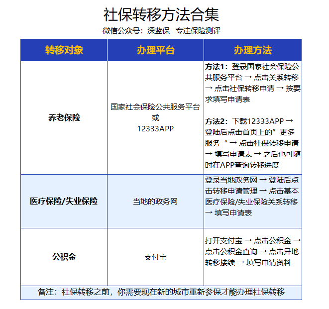 换城市工作,原来的社保怎么办?之前交的社保白交了吗?怎么转移? 发现很多朋友都很担心这个问题,所以我总结了非常实用的方法,准备或者已经换工作到其他城市的朋友们,不仅帮你省掉办事来回跑的时间,还能帮你避免大几万的损失! 对于开头的问题,我先给大家一个定心丸,换城市工作,之前交的社保不会白交,余额不会清零! 我们上班交的这五险一金,五险就是我们的社保,一金就是公积金。 其中,养老、医保、公积金有账户余额,这些永远都是记在你社保账户里的,就算换城市工作也不会清零。 而且养老、医保、失业保险是累计缴费年限的,换城市也没有影响。 另外生育、工伤保险,只要在新的城市参保了,就可以重新享受待遇。 那么问题来了,我换到新的城市以后,社保要不要转移过去? 有的人会告诉你“马上就转,一定要转”,但这个说法非常片面! 社保能转移的呢,只有养老、医保、失业保险和公积金四项可以转移。 而且需要每一项分开转移,办理的地方也不一样,跑来跑去费时费力。 其中,像养老、公积金、失业保险可以先不转,等未来决定在哪里退休了,再转才是最合适的。 但是医保,如果你的个人账户有余额,建议先转到新的城市,这样,你看门诊、买药都可以刷,不用自己再额外掏钱。 关于社保怎么转移,我专门帮整理了详细的操作方法,大家照着做就能少走点弯路,需要的朋友可以收藏一下。 虽然社保不用着急转移,但是到了新的城市要办理新的社保卡吗? 因为目前社保还没有全国联网,所以你到大多数城市都要重新办理新的社保卡。办新卡的具体的步骤我也详细整理好啦: 最后一个问题啊,也很常见,被外派、调职的朋友一定要注意,如果公司没有给你在新工作地交社保,而是在原城市继续交怎么办? 遇到这个问题可以先和公司商量一下,帮你在新工作地交。 如果不行的话,咱最重要的还是解决在外地看病的问题,一定要记得办一个异地就医备案。 这样呢即使你的社保在原城市,看病也可以正常刷卡报销。 具体可以看这篇文章介绍:《异地就医备案怎么办理?需要准备什么材料?看这篇就够了!》 趁着现在有时间精力,去自己想去的地方,做自己想做的事。 但是换城市工作一定要处理好社保,遇到不懂的社保问题,都可以问我,关注深蓝保,获得更多社保保险知识。一、换城市工作,原来的社保会清零吗?