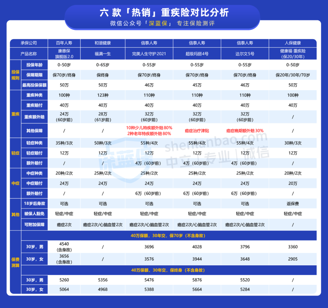 重疾险,即重大疾病保险,不像医疗险一样,所有疾病都能保,重疾险只有符合合同约定的疾病条件,保险公司才会赔一笔钱。 市面上的产品成百上千,产品形态更是五花八门,要不要附加身故?病种越多越好吗?保额买到多少?对于接触重疾险不多的人来说,要怎么挑选重疾险呢。 下面深蓝君就通过四步,手把手教会大家挑选重疾险。 第1步,保不保身故? 目前市面上的很多重疾险,都含有身故责任的,可以简单地看做“疾病”+“身故”两份保障。 这类产品,即使没有患病,身故了赔保额。换句话说,无论如何都能获得100%保额,所以这些产品的价格都不便宜,30岁男性,50万保额,普遍在1万-1.5万之间。 此外,市面上还有一种不含身故责任的重疾险,只关注疾病保障,没有寿险责任,这类产品我们称之为消费型重疾险。 这类产品,由于去掉了身故保障,另外还可以选择报道70岁或80岁,所以保费可以做到很便宜。 如30岁男性,50万保额,保到70岁,每年保费约在3000左右。 结论: 因为含身故的重疾险只能赔付一次,如果期间确诊了重疾,赔了保额,那身故就不能赔了。 所以建议大家首选不含身故的重疾险,如果想要身故保障,可以买一份寿险,价格产不多,保障反而更好。 第2步,病种越多越好? 主流的重疾险,都会有重疾、轻症、中症的保障,其中很多轻症、中症、前症都可以看做重疾的早期状态。 因为重疾定义比较严格,寻常情况是难以达到的;所以开发轻症、中症,是为了降低理赔门槛,即使没有达到重疾状态也有得赔。 如果得了重疾,就会赔100%保额;若这产品重疾只赔1次的,合同就会结束。如果得了轻症、中症或前症,就会赔少点,一般是30% - 60%保额之间;但赔完后合同一样有效,得了重疾还能赔。 既然罹患了合同中的病,重疾险才会赔的。那么,这款重疾险包括了什么病种,自然是很重要了。 重疾病种当然是核心,但是保险公司在此玩不出什么花样。 市场上的重疾险都必须包括以下的“28 种重疾 、3 种轻症”;而且疾病定义都是相同的,不存在你家宽松,我家严格的情况! 另外,这28种重疾占到了重疾理赔的95%左右,所以病种多是凑数作用。 所以,在重疾病种上,我们没必要纠结。 不少业务员都喜欢吹嘘自家产品定义更宽松,对投保人更友好。 其实,重要的重疾病种都是统一定义的,你专挑几种罕见病出来杠,没什么意义。 第3步,保到70岁还是终身? 重疾险选定期还是终身,关键看预算。 同样的一款重疾险,保终身会比70岁的贵1500左右。 预算不多:建议优先选择保到70岁,花更少的钱能买到更高的保额。等预算充足后,再适当增加保额 预算充足:可以考虑宝保终身,虽然保费较贵,但能保障一辈子。 第4步,我要买多少保额? 重疾险是为了弥补经济损失,所以重疾险的保额至关重要! 如果你两三年不能工作,只赔你十几万,够生活费用吗?够孩子的学费吗?够车贷、房贷吗? 你可以放弃大品牌,可以不要保终身、多次赔付,但是重疾保额,你一定不能妥协,低保额不如不买。 重疾保额最低30万起步,50万不过是标配,100万会更好。 我们测评了67款新定义重疾,结合保障、价格等维度,选出了7款性价比最高的产品。 直接说结论:一、重疾险怎么买
