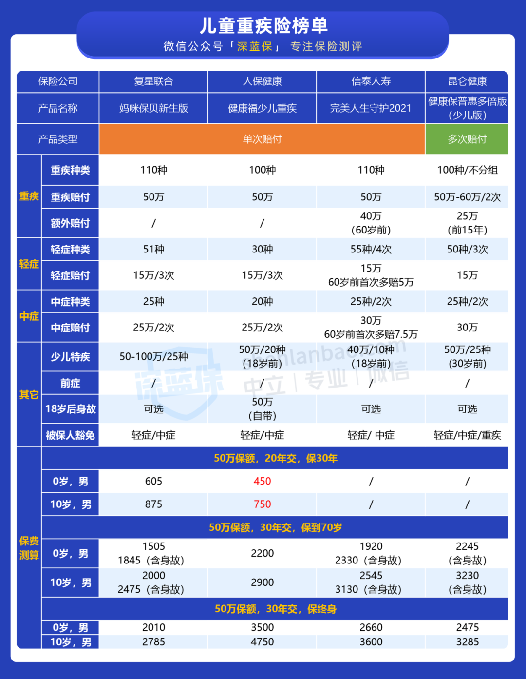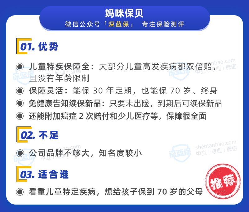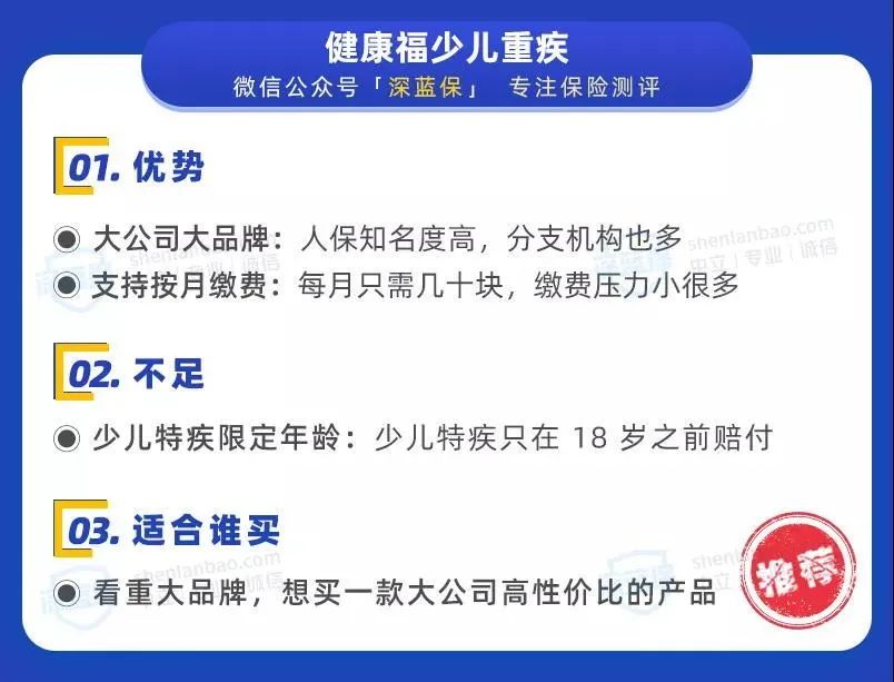孩子在父母心中是第一位的,在孩子的成长过程中,很多父母会给孩子配置保险,都说教育是最值得投资的,所以要先给孩子买教育金,这其实是一个误区,那么购买儿童重疾险还有哪些常见的误区呢?我们一起来看看吧~ 误区 1 :先买教育金 我国人民一向有存钱储蓄的习惯,很多父母喜欢给孩子买教育金,这是最常见的误区。 现如今,我国的义务教育水平已经很高了,绝大多数家庭也有能力支持孩子上学。 相反,我们更应该关注孩子的疾病和意外的保障,这些疾病和意外的开销是很大的,往往可以拖垮一个家庭的经济。 误区 2:先给孩子买,大人却裸奔 有的家庭收入不是很高,但是每年要在孩子的保险上花费很大的开销,等想要给自己买保险时,才发现预算不足了。 事实上,对一个家庭来说,大人的平安才是保障孩子健康成长的基本防线。所以,我们应该理性投保:先大人,后小孩。 如果父母不幸出险,至少孩子还能拿到一笔理赔金,可以维持以后的日常生活,继续接受教育。 误区 3:要买就买最好的 父母总想把最好的留给孩子,但保险只是一个保障工具,本身并无好坏之分。 如果预算充足,保障当然是越多越好,保障时间也是越长越好。但是如果预算有限,更推荐购买定期重疾险,因为每年就只用花费几百块钱,就能收获不错的保障。 保险是一个多次配置的过程,等我们以后预算变多了,或者孩子长大后有能力赚钱了,我们就可以再增加其他新的保障。 以上就是深蓝君在购买儿童重疾险中需要注意的误区,希望能帮到大家。市面上的儿童重疾险产品这么多,我们怎么选择呢? 由于目前市场上新定义下的儿童重疾险不多,深蓝君从中挑选了其中比较优质的4款向大家介绍一下: 结论: 如果关注高性价比,可以选择妈咪保贝新生版,详细测评点击这里就能查看>>>; 如果关注定期重疾,可以选择健康福少儿重疾。 温馨提示:健康福少儿版要在支付宝购买,在支付宝搜索 “江南app官方下载苹果