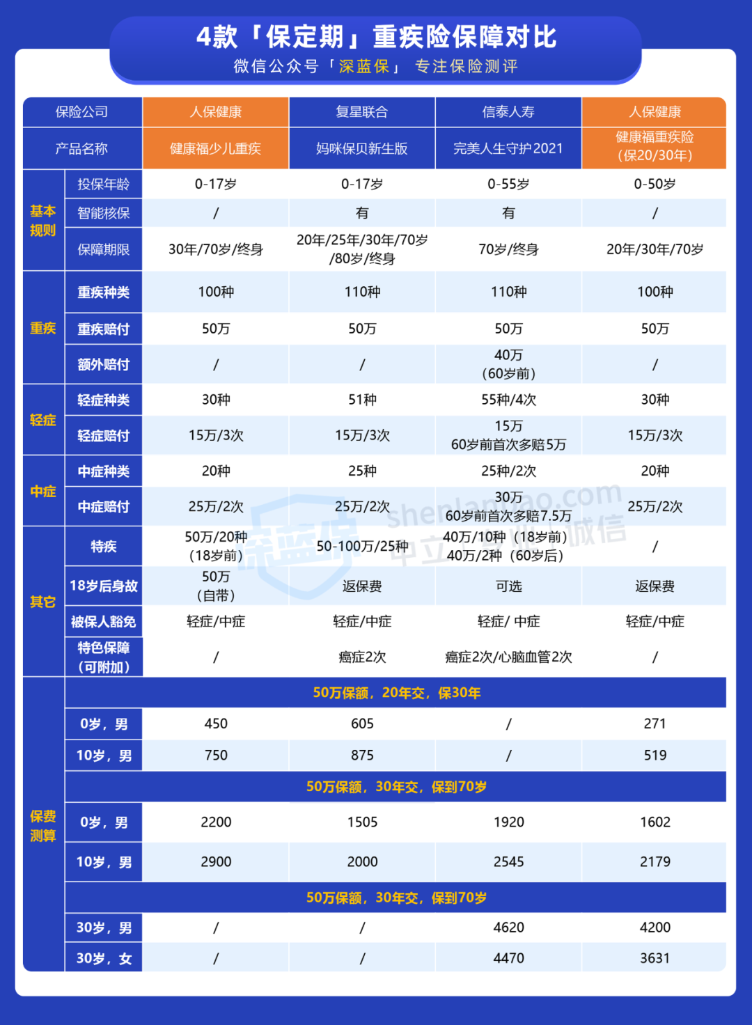 健康福有两款保定期的产品,分别是健康福少儿重疾和健康福重疾险(保 20 / 30 年)。