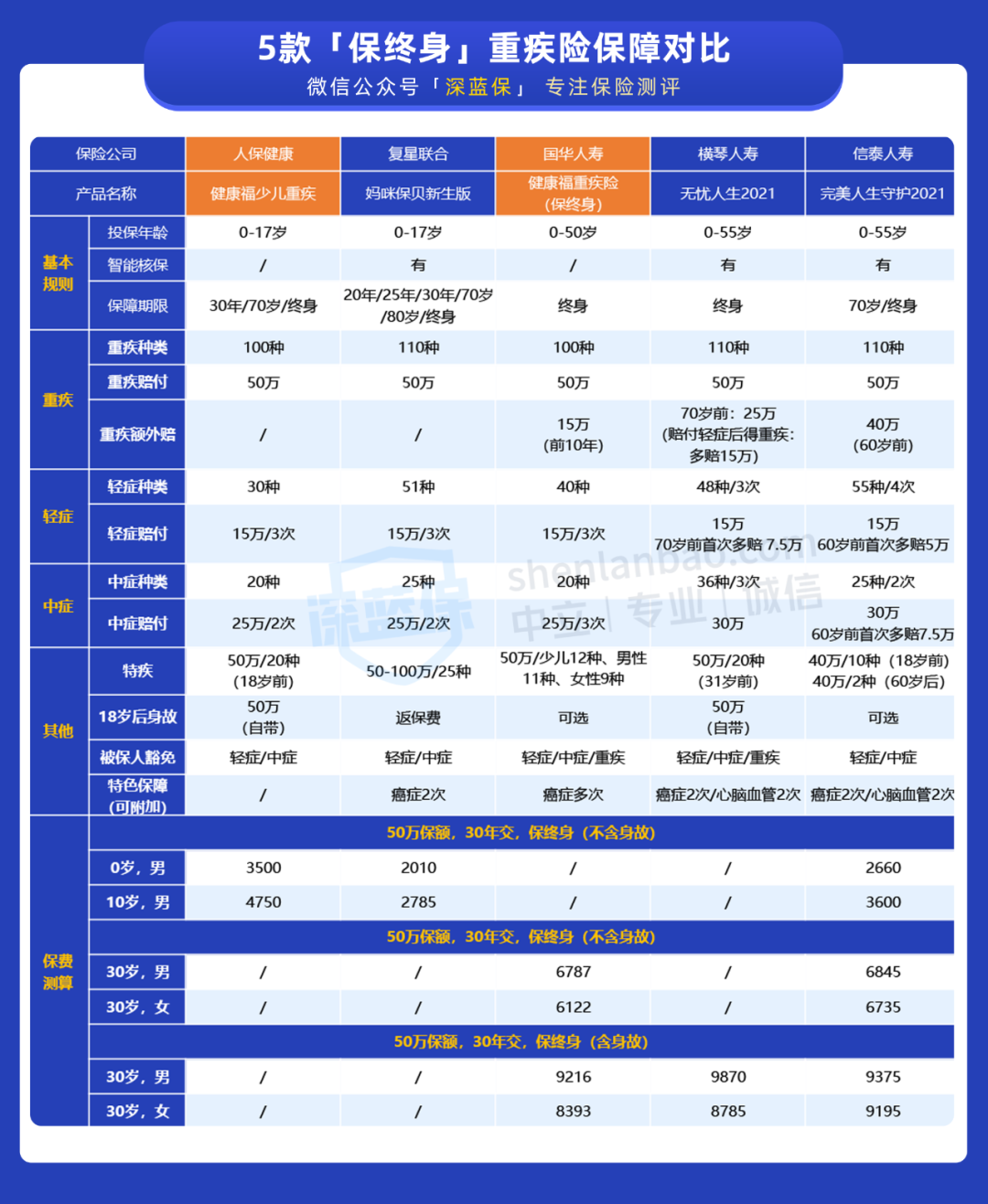 除了保 1 年和定期的,健康福有 2 款终身重疾险,主要适合预算比较充足的朋友。这两款到底值不值得买?我们选了另外 3 款同类型产品作为对比: