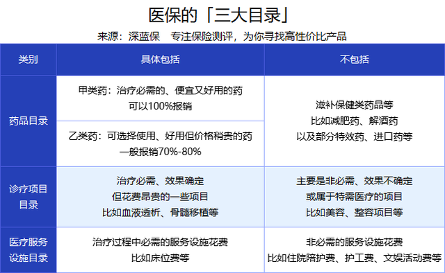 医疗保险通常分为两类,一是国家医保,二是商业医疗保险。我们平时很熟悉的就是国家医保,因为跟我们每个人息息相关,我们都会参保国家医疗保险。 商业医疗保险有常见的百万医疗险、小额医疗险,还有一些专门保障特定疾病的医疗险等等。今天,深蓝君就为大家介绍一下,商业医疗保险有什么用? 为什么说商业医疗保险是国家医保的补充保障呢?因为国家医保是一种普惠型福利政策,覆盖范围广、参保门槛低,作为一种基本医疗保险,国家医保也有一些不足的地方,需要商业医疗保险来补充保障。 不足体现在以下几个方面: 1、国家医保报销有限制 国家医保设有起付线和封顶线。 起付线就是小于一定的金额,不能报销; 封顶线是超过一定的金额,超过的部分也不能报销。 并且,国家医保的报销范围受医保目录限制,医保有三大目录: 医保能报销的药品,分为甲类和乙类,并且乙类是按照一定比例报销的。医保能报销的诊疗费用是“合理且必需的”,比如治疗费、检查费、手术费等。医保能报销的服务设施主要是普通病房的床位费,要是VIP病房的就得自己掏了。不在医保三大目录内的,都是不能报销的。 商业医疗保险就可以弥补这一不足,比如百万医疗险的保额一般是200万或300万,那么超过国家医保封顶线的部分,就可以用百万医疗险报销了,而且不限社保,社保内外都可以报销。 2、国家医保一旦断缴,就不能使用 如果国家医保停缴了,第二个月就不能再使用医保报销,一旦断缴三个月甚至更长,统筹账户里之前缴纳的钱就会清零,不仅无法报销医药费,每年的报销上限也会降低。 如果在失业期间,医保断缴,又不幸因病住院,医疗费用全部得由自己承担,生活压力一下就变大了。 如果有商业医疗保险,那么就可以用商业医疗保险来报销医疗费用,给自己减轻负担。 既然商业医疗保险是国家医保的补充保障,那么我们就来看常见的一些商业医疗保险的作用分别是什么? 1、百万医疗险 百万医疗险主要保障一般住院、重疾住院、特殊门诊、门诊手术和住院前后门急诊。百万医疗险的价格很低,几百块钱就能买到两三百万的保额。 它的作用就是可以用来报销高额的医疗费用,而且像特效药、进口药这种医保没法报销的项目,百万医疗险也可以报。 2、小额医疗险 小额医疗险之所以叫“小额”,是因为它的保额很低,一般也就1-5万的保额,但是没有免赔额,只要是看病花了钱,不管是100块还是几千块,都能报销,所以它的作用就是报销因小病小痛产生的小额医疗费用。 适合小孩或身体条件不好的人,经常感冒发烧,三天两头就得去医院看病的人。如果有这样的情况,就可以考虑小额医疗险,保障门诊和住院。 3、防癌医疗险 防癌医疗险只针对因癌症产生的医疗费用,有两个特点: 健康告知宽松:三高的人也能买; 投保年龄广:80岁也可以买。 适合身体健康状况不太好的老年人,比如有三高没办法买百万医疗险的,就可以考虑防癌医疗险。大家都知道癌症的治疗费用是很高的,一些高发病率癌症也是在保障范围内,所以防癌医疗险的作用就是也能解决因癌症产生的一大笔医疗费用。 4、高端医疗险 高端医疗险是面向高收入人群的,能够全面解决医疗费用。高端医疗险的保额很高,国内最高可以买到6300万的保额。高端医疗险提供医疗费用直付服务,并且医院的选择范围很广,全球的知名医院、或者国内顶尖的国际部/特需部都能选。 不仅医院设施高级,而且服务也相当到位,所以它的作用就是解决追求极高就医体验而产生的费用。 商业医疗保险可以以小博大,用较低的保费获取较高的保额,既能报销高额的医疗费用,又能提高就医体验,是国家医保的补充保障。 所以,在有国家医保的情况下,再挑选一份适合自己的商业医疗保险作为补充。一、商业医疗保险是国家医保的补充保障