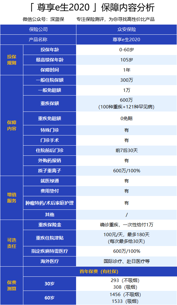 尊享e生2020是众安保险旗下的一款百万医疗险,尊享e生2020保障全面,性价比高,一直以来都受到广大消费者的追捧。 还有很多朋友不太了解尊享e生2020和众安保险公司,会有所顾虑地问,尊享e生2020值不值得买,众安保险公司值不值得信任呢? 今天,深蓝君就带大家来了解一下尊享e生2020和众安保险公司。 1、基本信息 众安保险公司全称为众安在线财产保险股份有限公司,2013年在上海黄浦区成立,注册资本人民币14.698129亿元。 众安保险是阿里巴巴、中国平安、腾讯联手开创的互联网保险公司,其中最大的股东是阿里巴巴。 阿里巴巴、中国平安、腾讯都算得上国内外的知名企业,所以大家不用担心,众安保险公司是很靠谱的。 2、偿付能力 保险公司的偿付能力通常通过偿付能力充足率来反映,深蓝君查阅了众安保险官网的资料,找到了他们2020年第四季度的偿付能力充足率,整理如下: 核心偿付能力充足率:560.48% 综合偿付能力充足率:560.48% 风险综合评级:A 可以看出,2020年末众安保险公司的偿付充足率为560.48%,该公司的偿付能力是非常充足的。 总体来说,众安保险公司的整体实力是非常不错的,值得信赖。 尊享e生2020保障很全面,深蓝君整理如下: 从上图看,尊享e生除了一般住院保障、重疾住院保障、特殊门诊、门诊手术和住院前后门急诊外,还有两个重点值得关注: 可附加重疾保险金和重疾津贴:罹患约定的100种重疾,直接赔付1万元;如果因为重疾住院,还有100元/天的津贴。 自带质子重离子:质子重离子对治疗癌症有着显著的效果,尊享 e 生2020自带质子重离子保障,最高600万保额,100%报销。 另外,尊享e生2020在价格上也做了区分,不吸烟的人要比吸烟便宜几十块钱,这算是一个不错的创新,根据健康状况区别保费。 总的来说,尊享e生2020保障比较齐全,性价比不错,值得考虑。 虽然尊享e生2020保障齐全,但也还是有不足的地方: 1、外购药更严格 当我们在医院看病时,有时候医生开的药医院没有,要去外面的药房买,这种就是外购药。 尊享e生2020只报销抗癌外购药,对于非抗癌的外购药就没办法再报销了。 虽然常用的抗癌药仍然可以申请报销,但药品报销范围没有之前广。 2、取消了部分增值服务 相比较于尊享e生2019版,2020版取消了附加赴日医疗、特需病房报销这两项。 如果你继续选择续保2019版,那么赴日医疗、特需病房报销到时候还能选择;如果选择续保2020版,就没有这个选项了。 尊享e生系列产品一直以来,都可以说是百万医疗险的领跑者,总体来说,尊享e生2020是一款非常值得考虑的产品。一、众安保险公司靠谱吗?