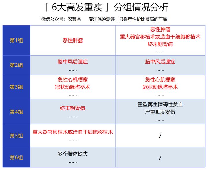 所以对于疾病分组的重疾险,我们一定要重点关注 6 大重疾的分组情况。