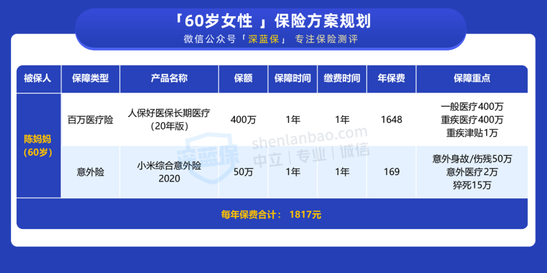 所以,我们只给陈妈妈搭配了百万医疗险和意外险,生病住院的花销、意外磕碰的治疗费都可以报销。