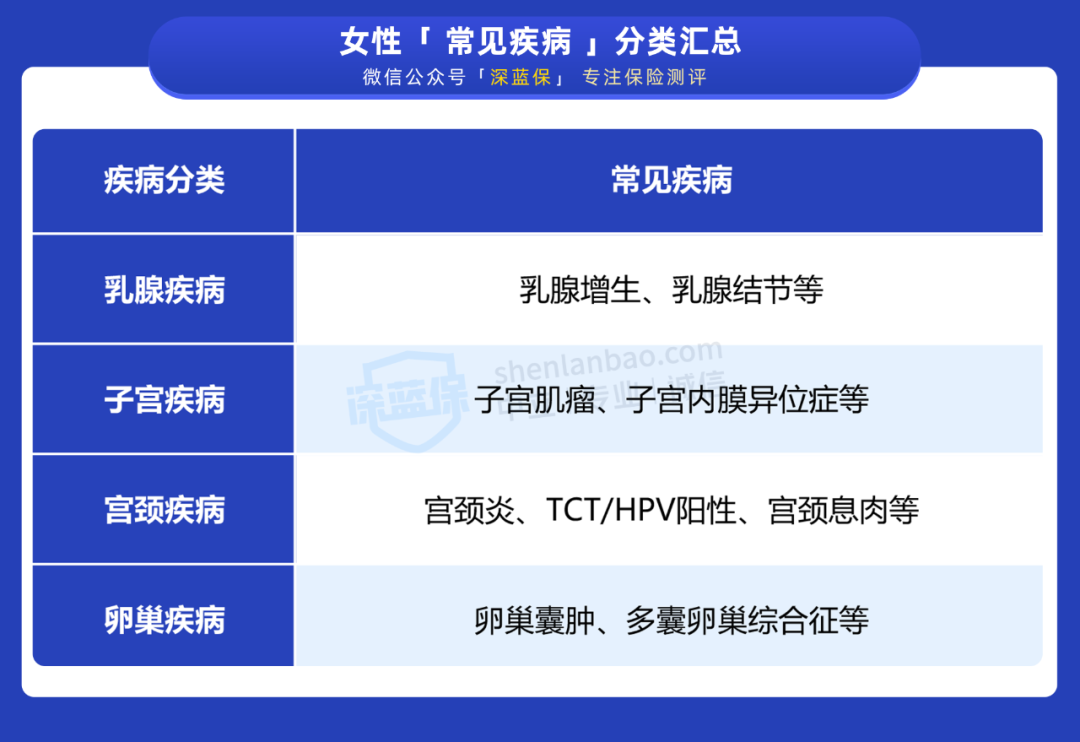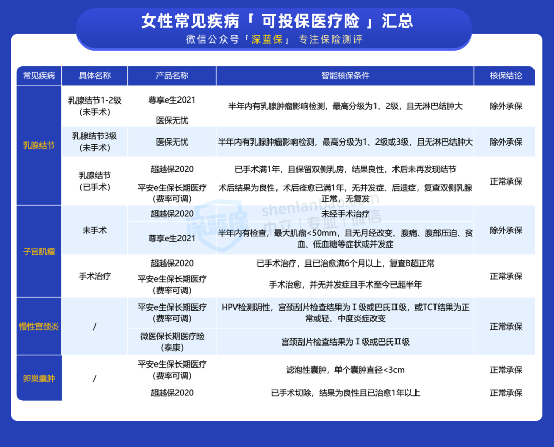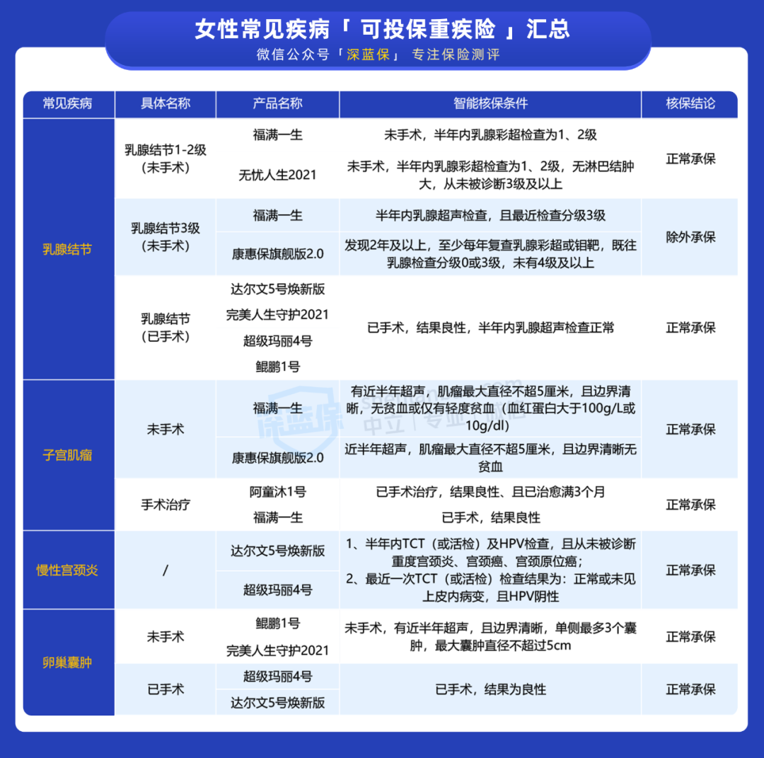 从表格可知,子宫肌瘤、慢性宫颈炎、卵巢囊肿这几种女性疾病,只要满足条件,大部分重疾险都能正常承保。