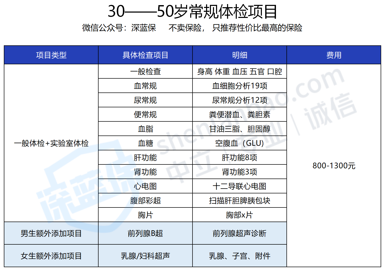 一般常规体检项目几百到一千多元,我们以30-50岁的体检而言: