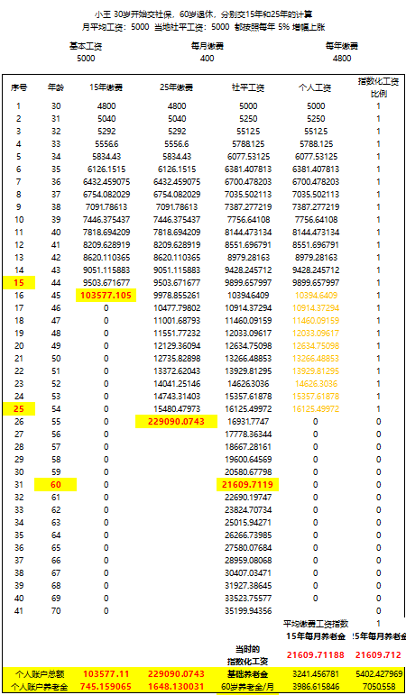 这里我给大家简单演算一下,假设小王每个月的工资和当地社平工资一样,都是5000块,而且每年按5%的水平增长。