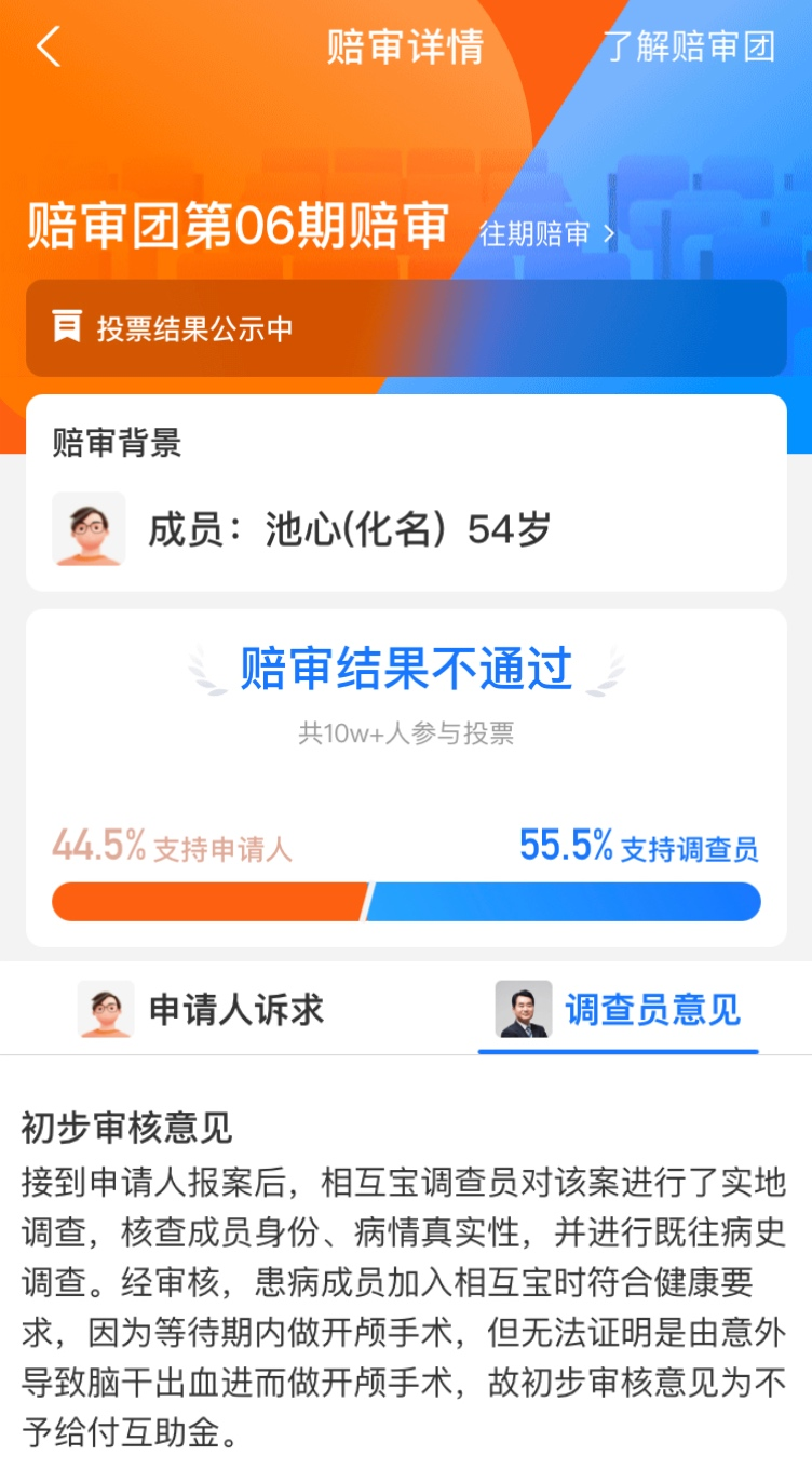但最后55%的人支持调查员,没有理赔。相互宝的这个陪审团制度相当于制度之外的人情。