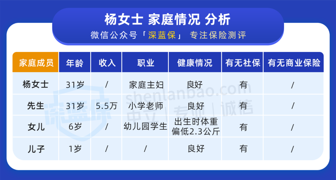 我们不能为了买保险而影响生活,现在杨女士要在家带娃,没有收入,先生收入还要养一家,因此没有太多预算买保险。