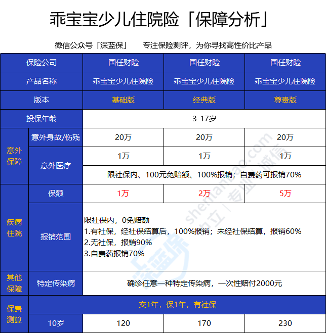 乖宝宝少儿住院险是国任财险推出的一款小额医疗险,针对少儿住院医疗报销,还有意外医疗保障,和传染病赔付责任,保障全面,价格也不贵。