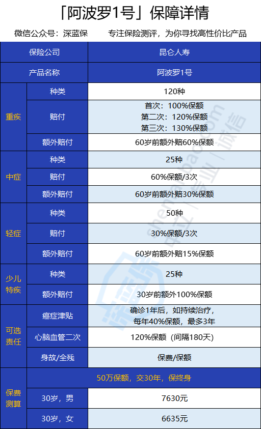 阿波罗1号重疾险是昆仑人寿旗下的一款重疾险产品,这款产品重疾可以不分组多次赔付,并且保障力度也不错。