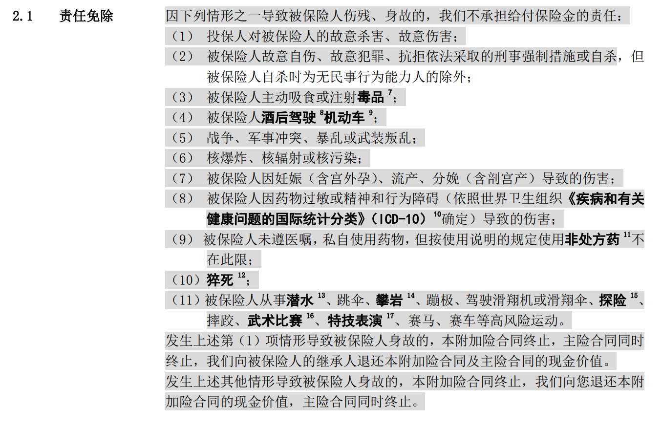 我们再来看一个更关键的,意外险的更新迭代很快,像以前的意外险都不保猝死,因为猝死严格来说不算意外,但现在好的产品都会保,这份长期意外险明显跟不上时代了,也是不保的。