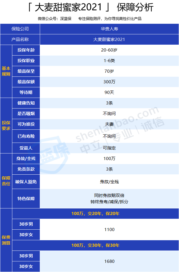 大麦甜蜜家2021是华贵人寿旗下的一款定期寿险,属于夫妻共同投保的产品,并且健康告知和免责条款都比较少,有利于投保人。