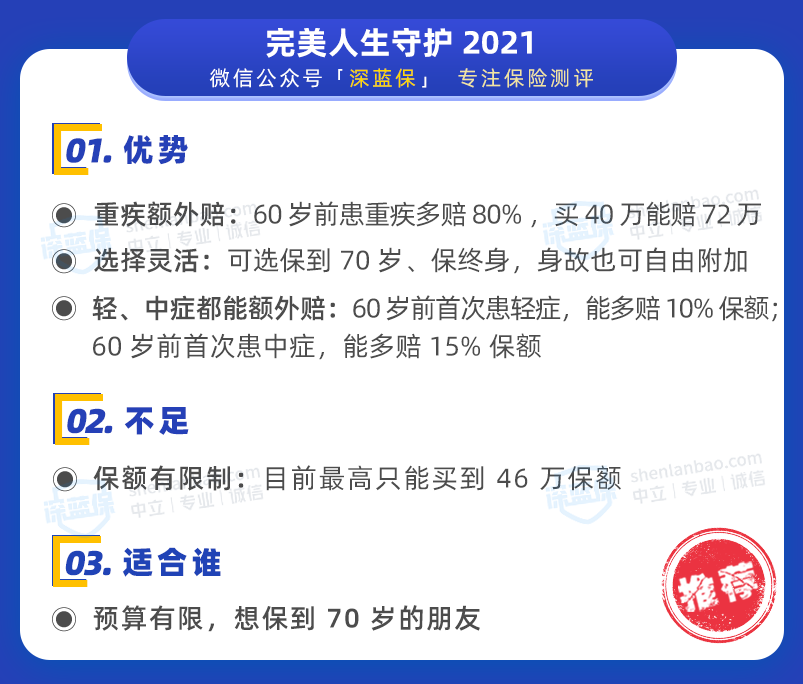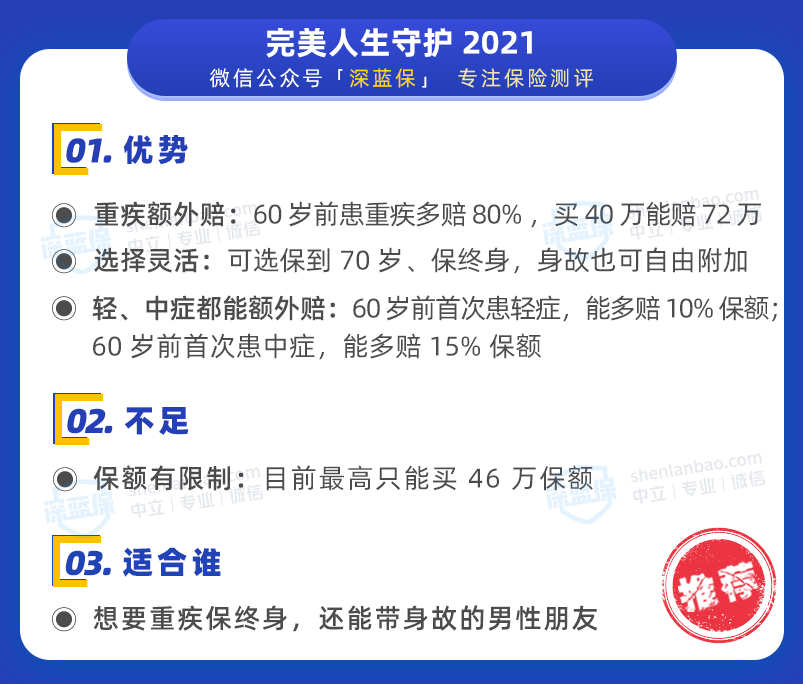 完美人生守护 2021 则更适合男性保终身含身故,它的优势不足如下: