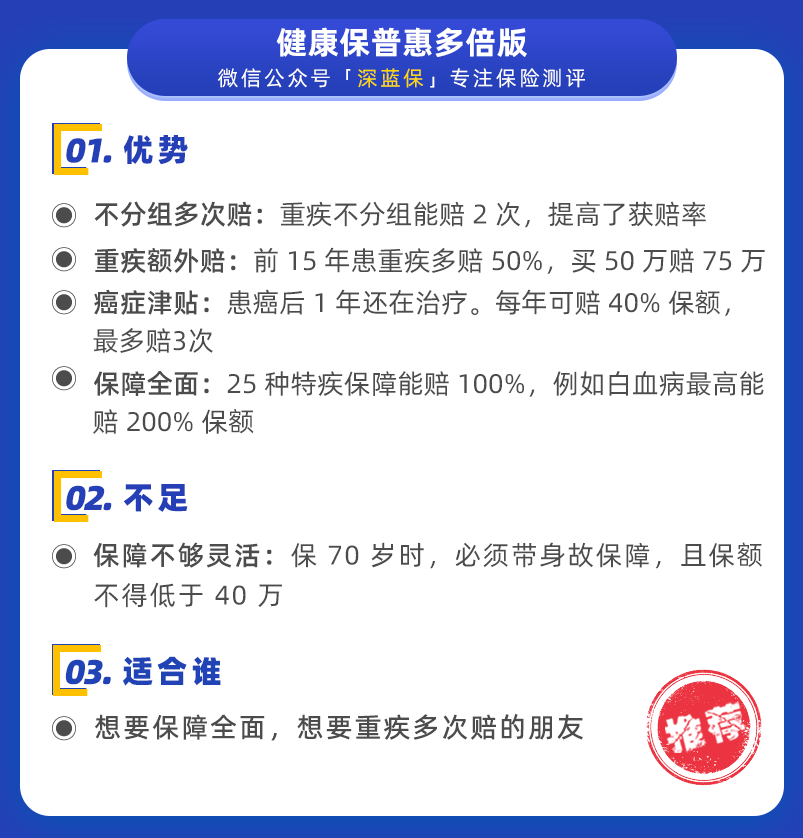 健康保普惠多倍版 重疾不分组能赔 2 次,保终身性价比非常高。