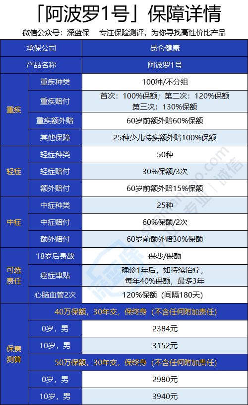 整体来看,阿波罗1号这款产品,重疾、中症、轻症都可以多次赔,还有针对30岁前确诊25种少儿特疾的双倍赔,还是可以给小孩子投保的。