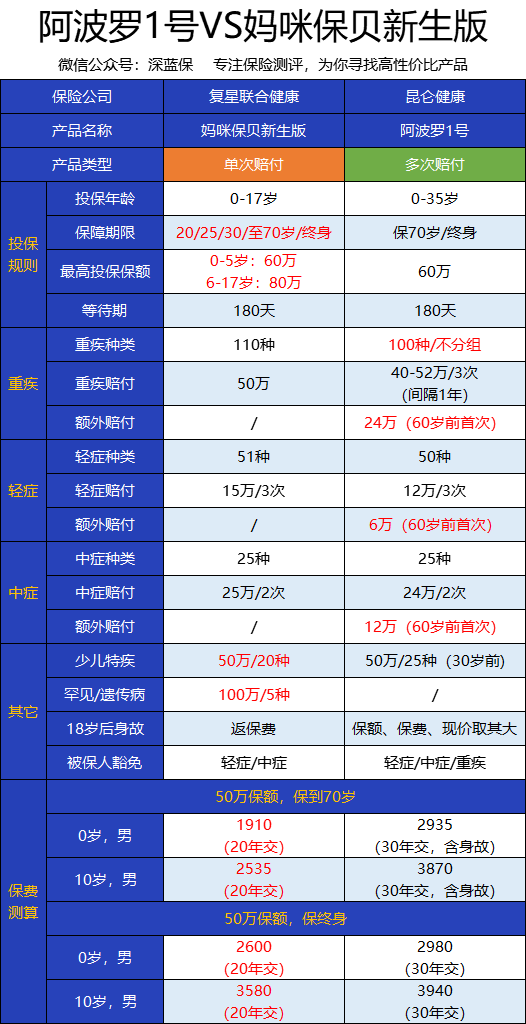 阿波罗1号是一款多次赔付重疾险,重疾、轻/中症都能多次赔付,面向36岁以下的人群进行承保;而妈咪保贝新生版则是一款单次赔付重疾险,承保仅面向未成年人。