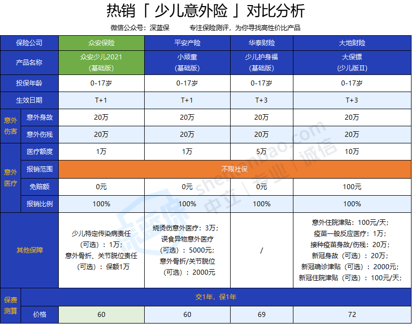 深蓝君选了三款市面热销的少儿意外险来和它作对比,看看是否值得购买?