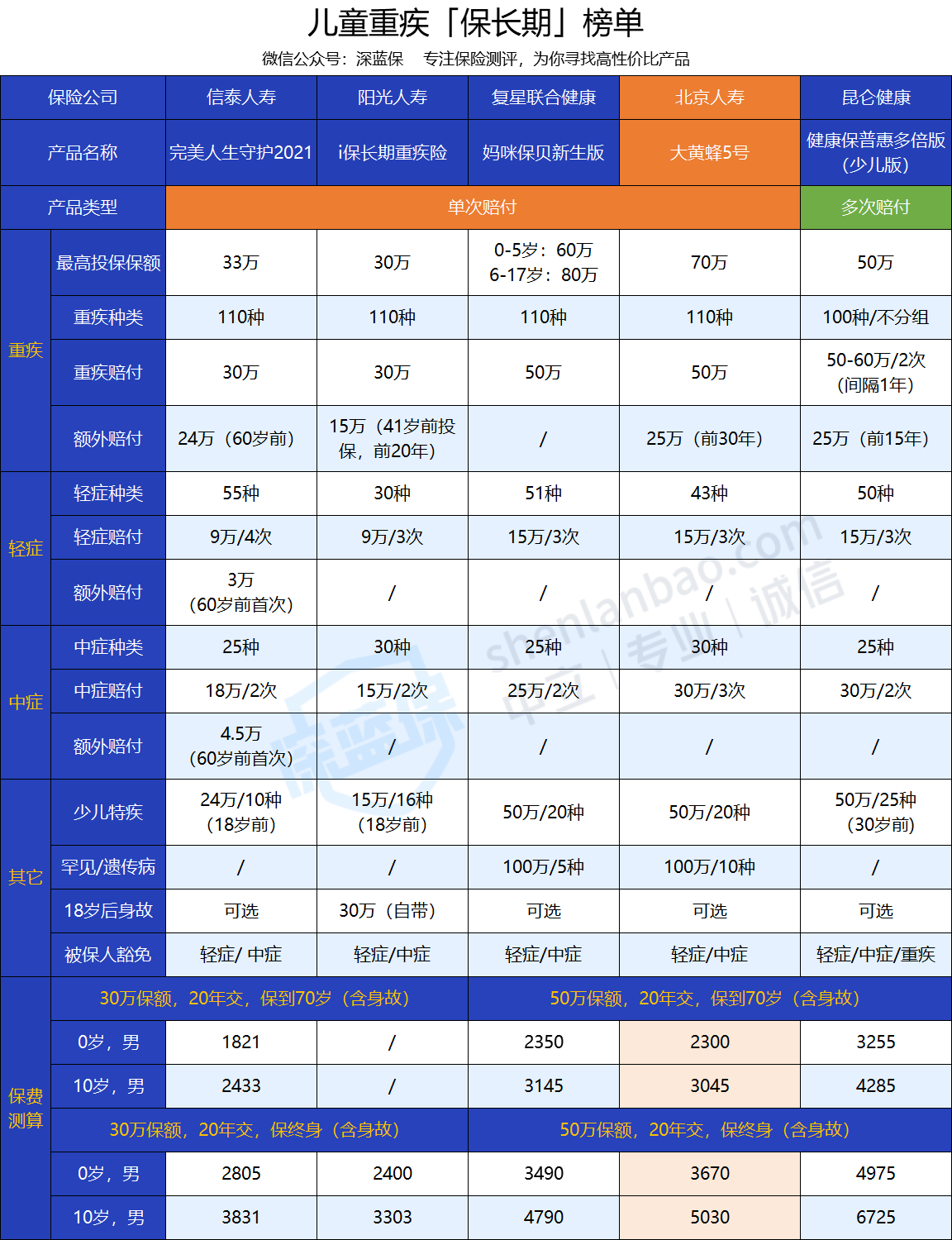 深蓝君挑选了市面热销的儿童重疾险来对比看看: