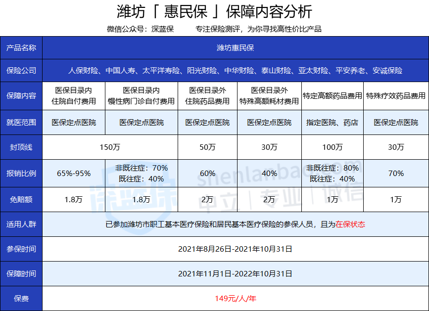 潍坊惠民保是由潍坊市医保局、税务局等多家政府指导,人保财险等多9家保险公司共同承保的商业补充医疗险。