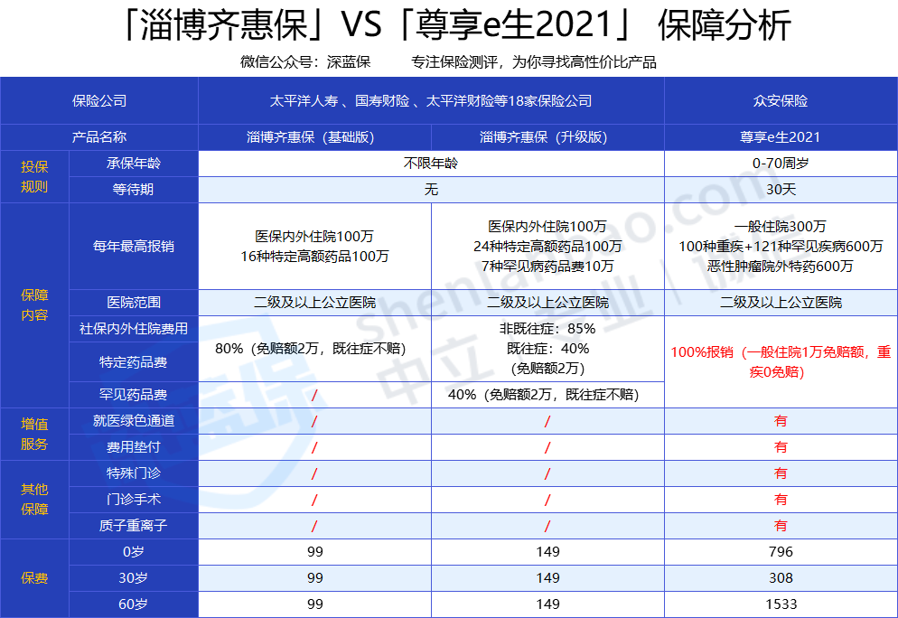 深蓝君挑选了一款百万医疗险,众安保险的尊享e生2021与淄博齐惠保进行对比,看看它们有什么区别?