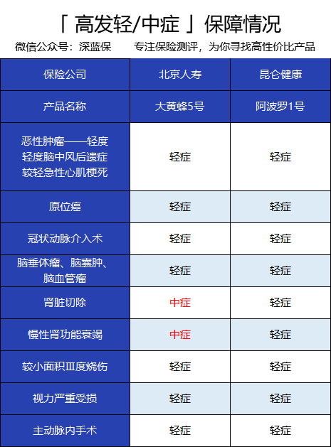 可以看到,两款重疾险的高发轻中症保障都没有缺失,其中大黄蜂5号有两种症状按中症赔付,赔付比例更高。