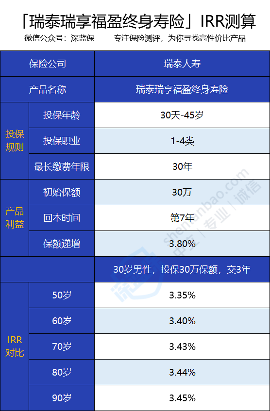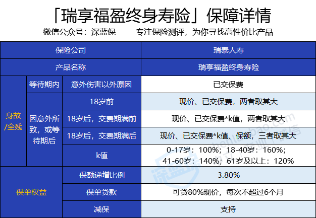 瑞泰瑞享福盈终身寿险的保额,每年增长3.8%,即只要人还活着,保额就一直增长。