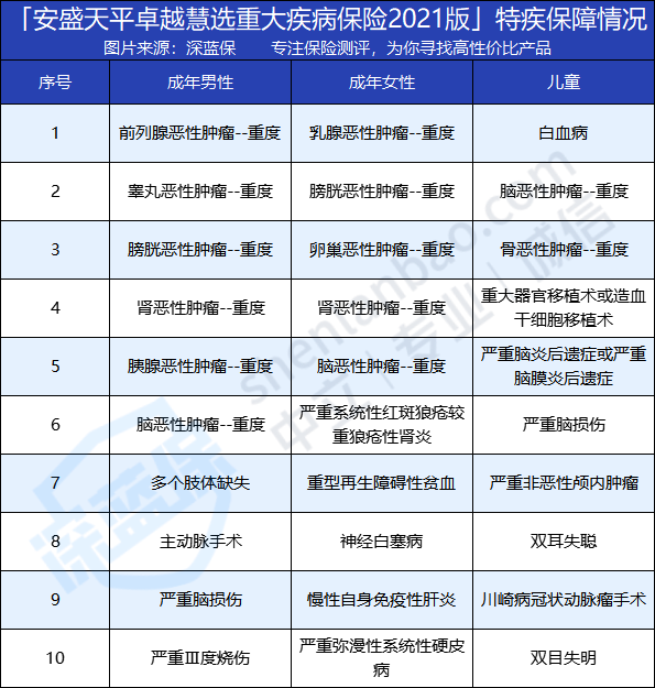 这款产品可选特疾责任,保障少儿/男性/女性各10种特疾,具体如下: