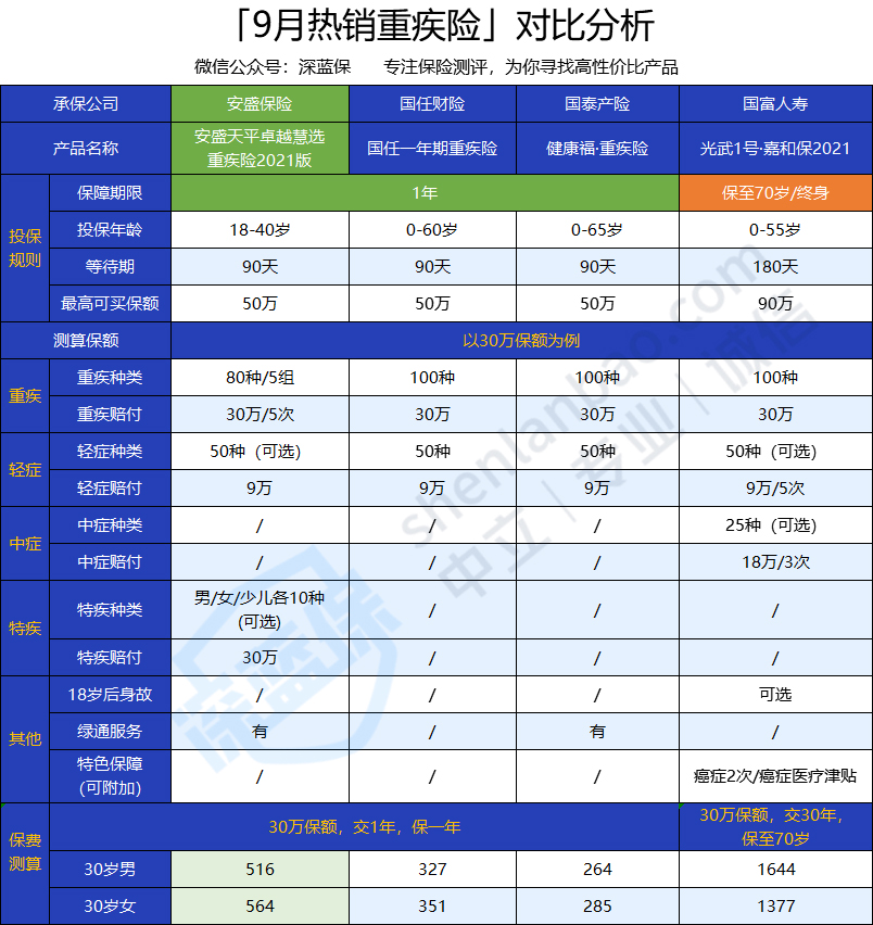 深蓝君挑选了几款市面上热销的重疾险和它进行对比: