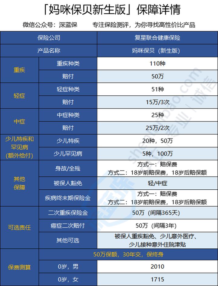 这款保障重疾、中症、轻症、少儿特疾和罕见病,可选重疾二次赔且病种不分组。