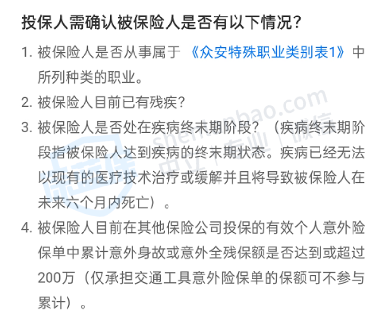 一般意外险都没有健康告知的,而这款需要告知,会询问被保人的职业、是否残疾、是否达到疾病终末期、意外险保额等情况。