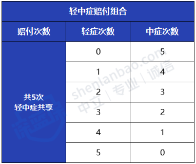 40种轻症和25种中症,共享赔付次数,一共5次,轻症每次赔付30%基本保额,中症每次赔付50%基本保额。