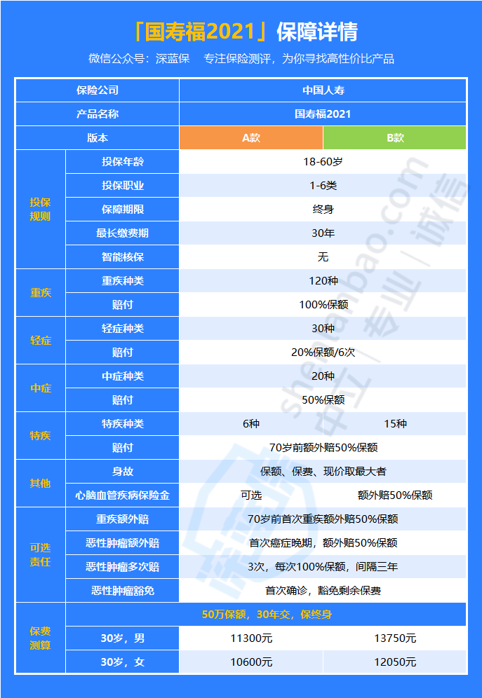 国寿福终身重大疾病保险分为A、B两个版本,中症和轻症都有保障,自带身故,还有癌症多次赔等一些可选责任。