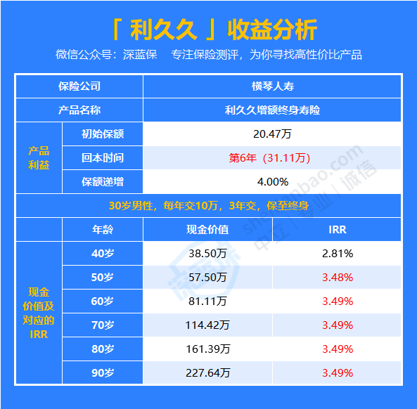 而且,50岁往后的IRR都在3.48%以上,在增额终身寿里面,是一等水平的收益了。