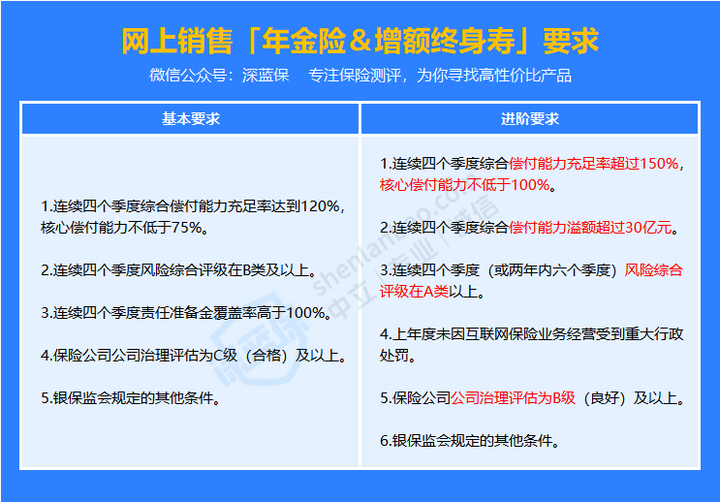 新规出台了一系列整改互联网保险的举措,其中,对于网络销售增额终身寿和年金险的保险公司提出了一些要求: