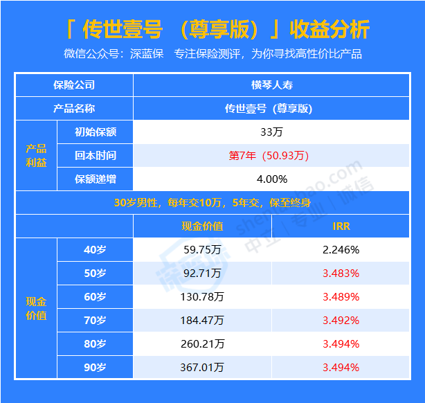 整体来看,在50岁及以后,传世壹号尊享版的收益率都非常接近3.5%,是增额终身寿中一等收益的产品了。