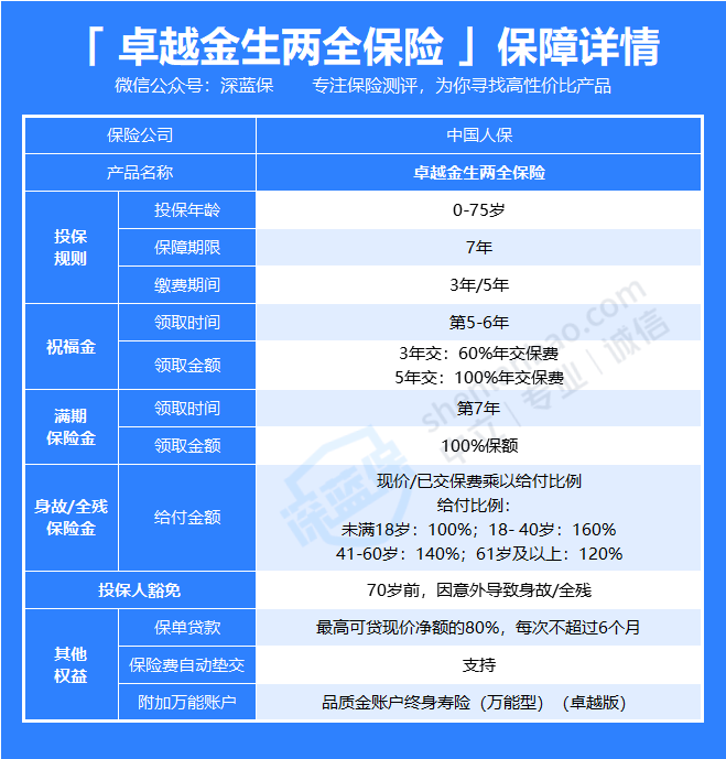 卓越金生年金保险保障期为 7 年,可选3年或5年缴费,投保后第5年开始给付祝福金,到第7年满期则给付100%保额作为满期金,身故则另外给付身故金。