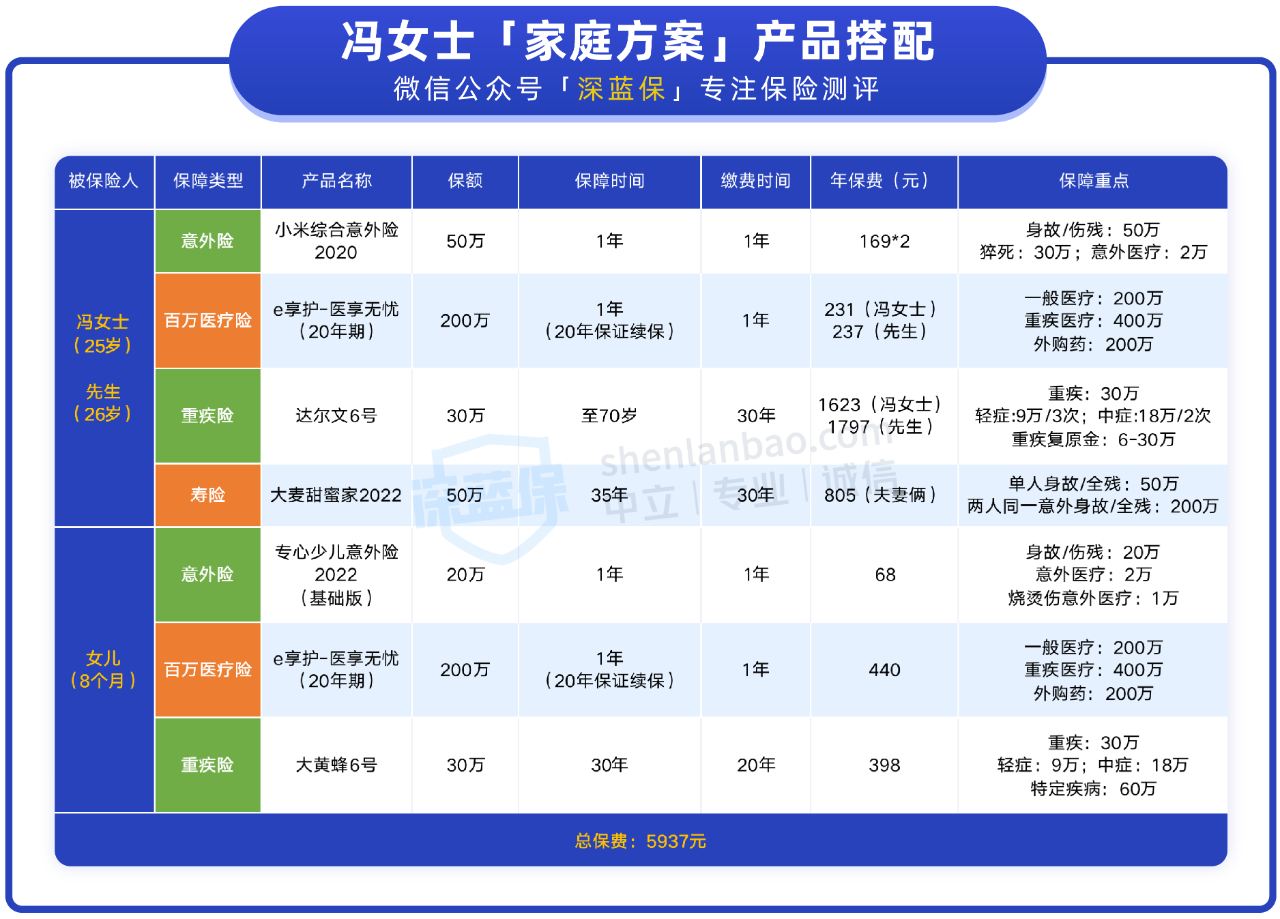 配齐一家三口的保险,总共花费 5937 元,人均不到 2000 元,在冯女士的预算内,保障也挺全面,可以说性价比很高。